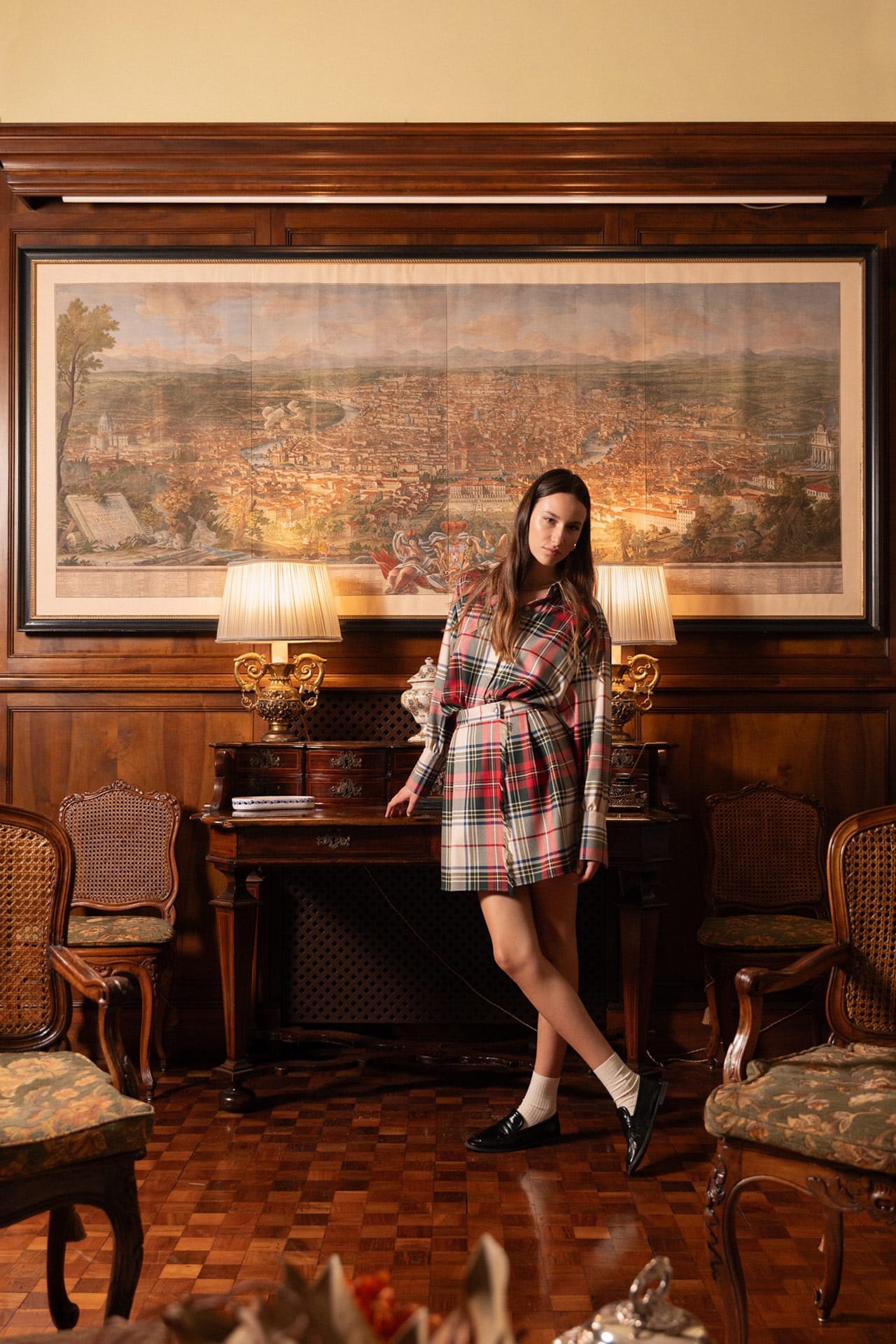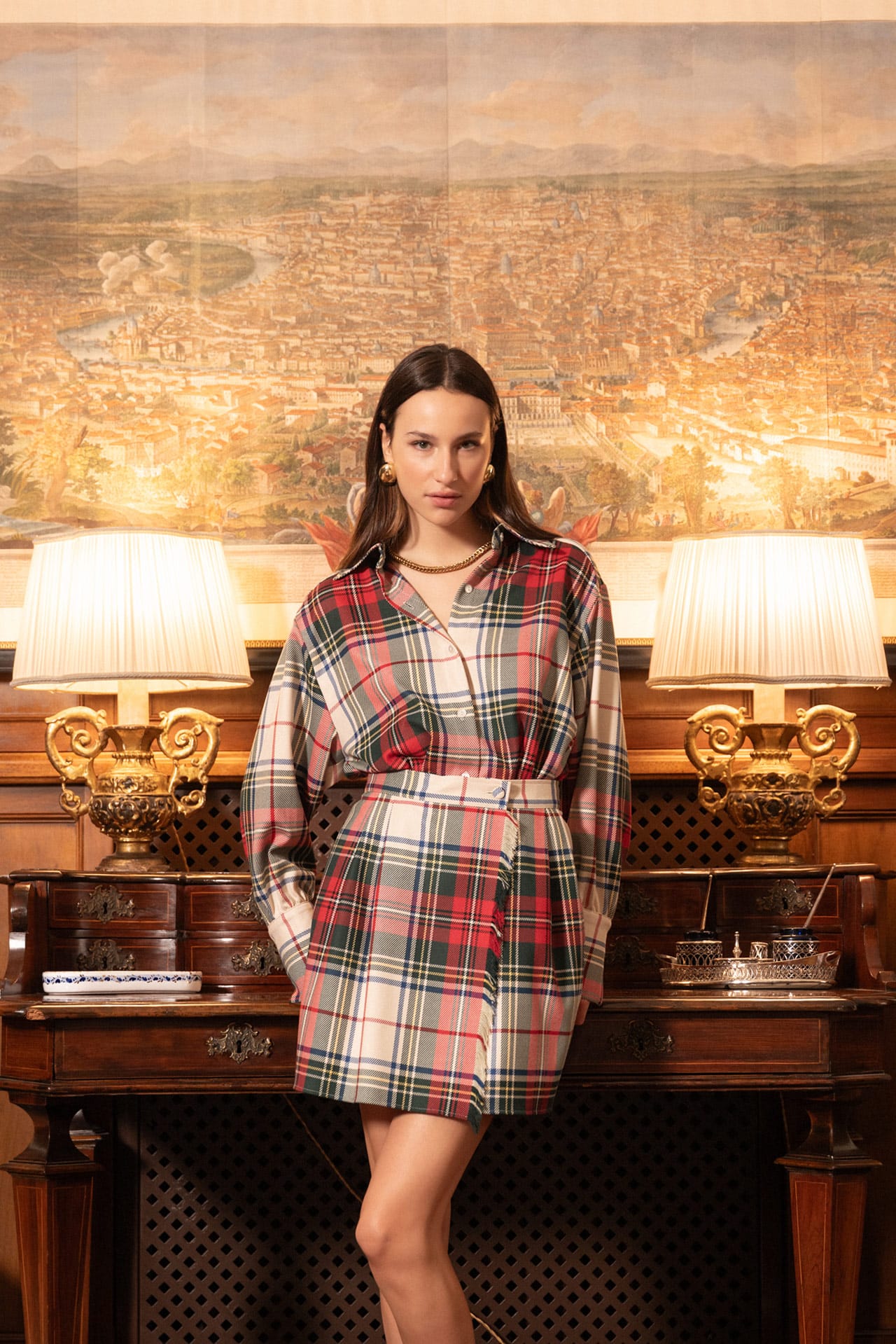 Una nuova camicia sartoriale oversize con abbottonatura frontale, realizzata in tessuto tartan di alta qualità.