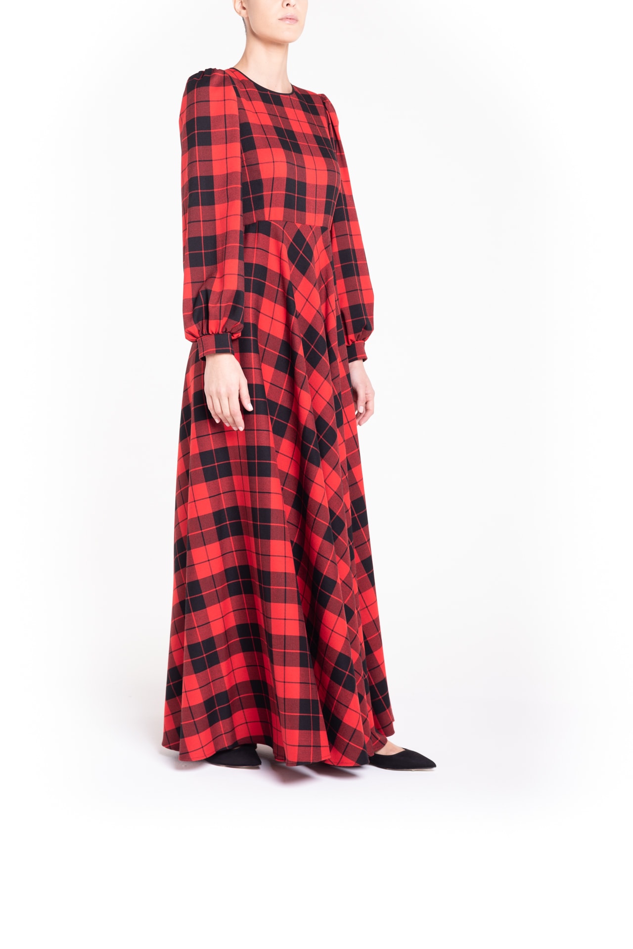 Vestito lungo in tessuto scozzese con morbida gonna ruota finale.