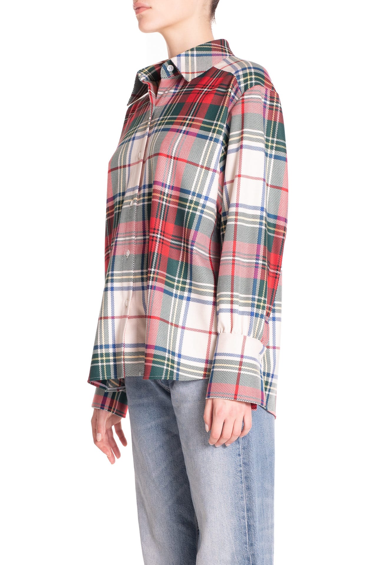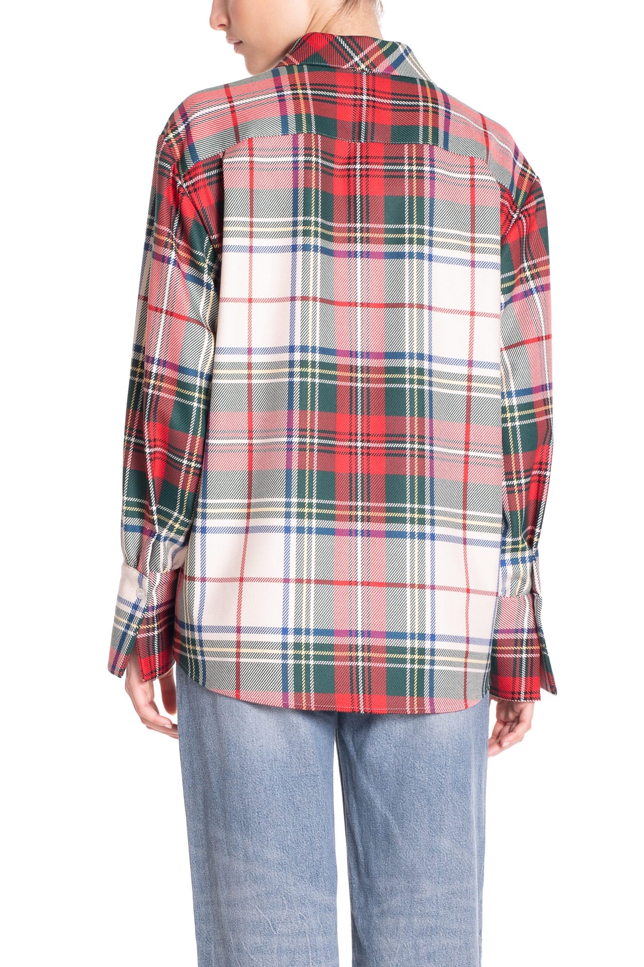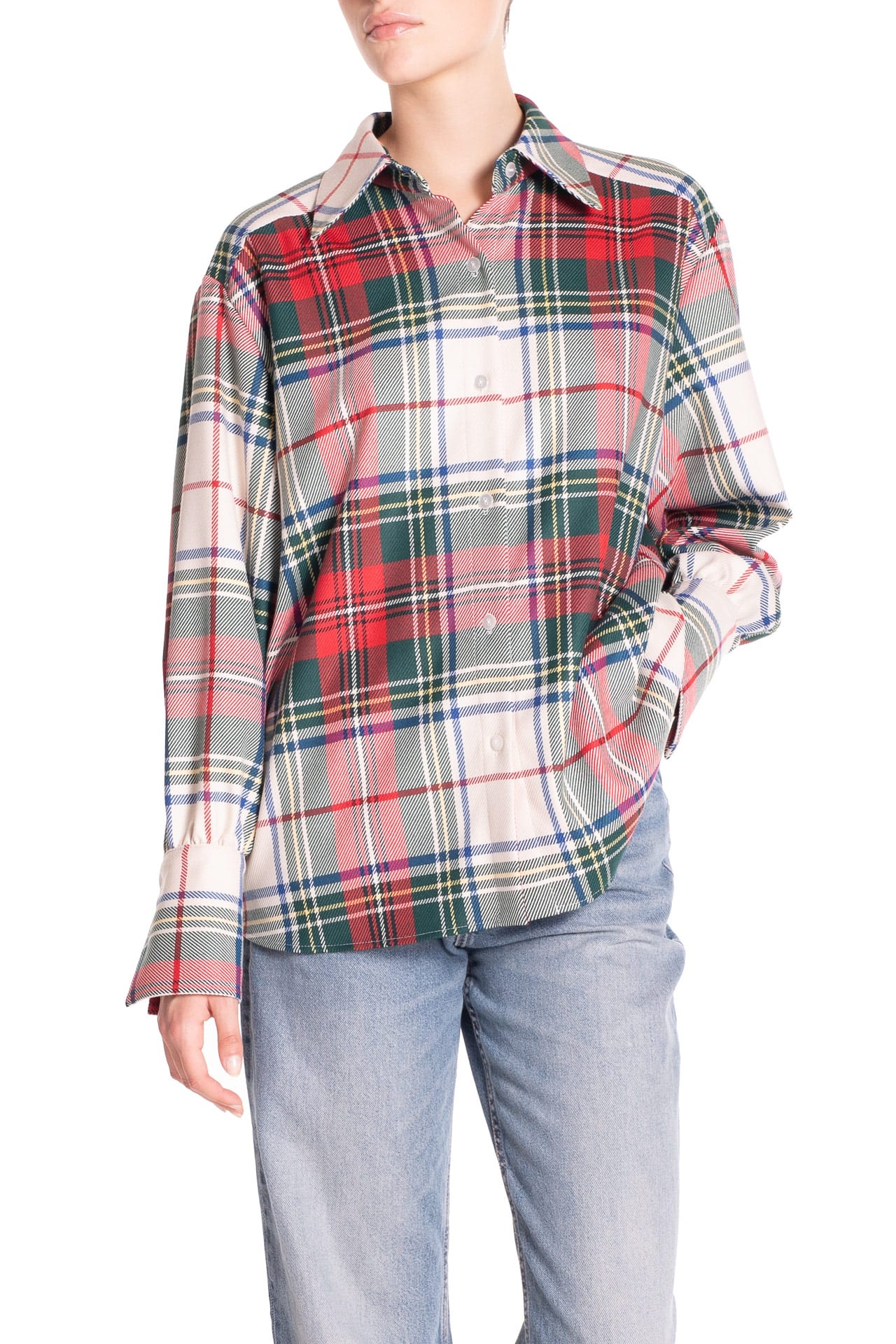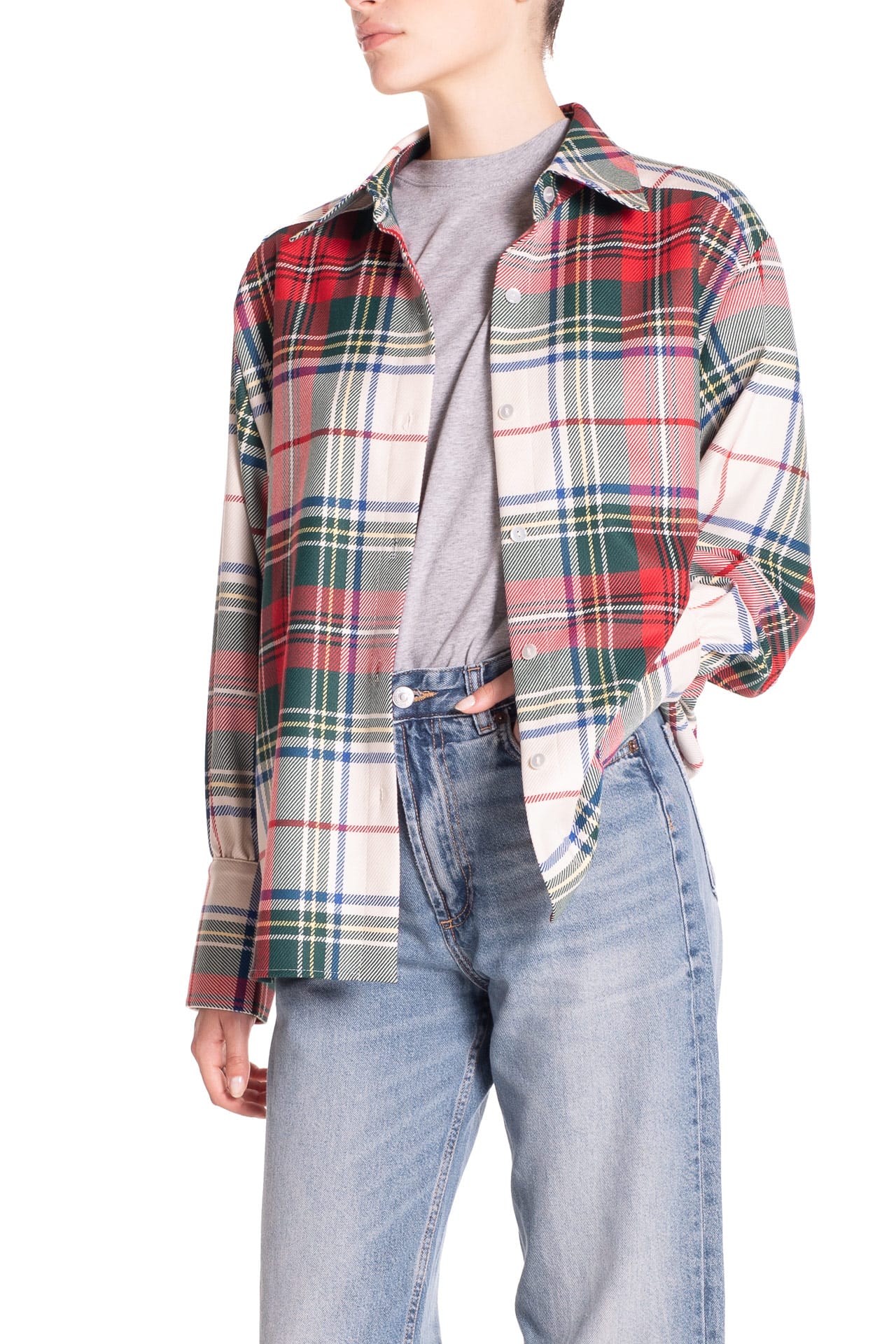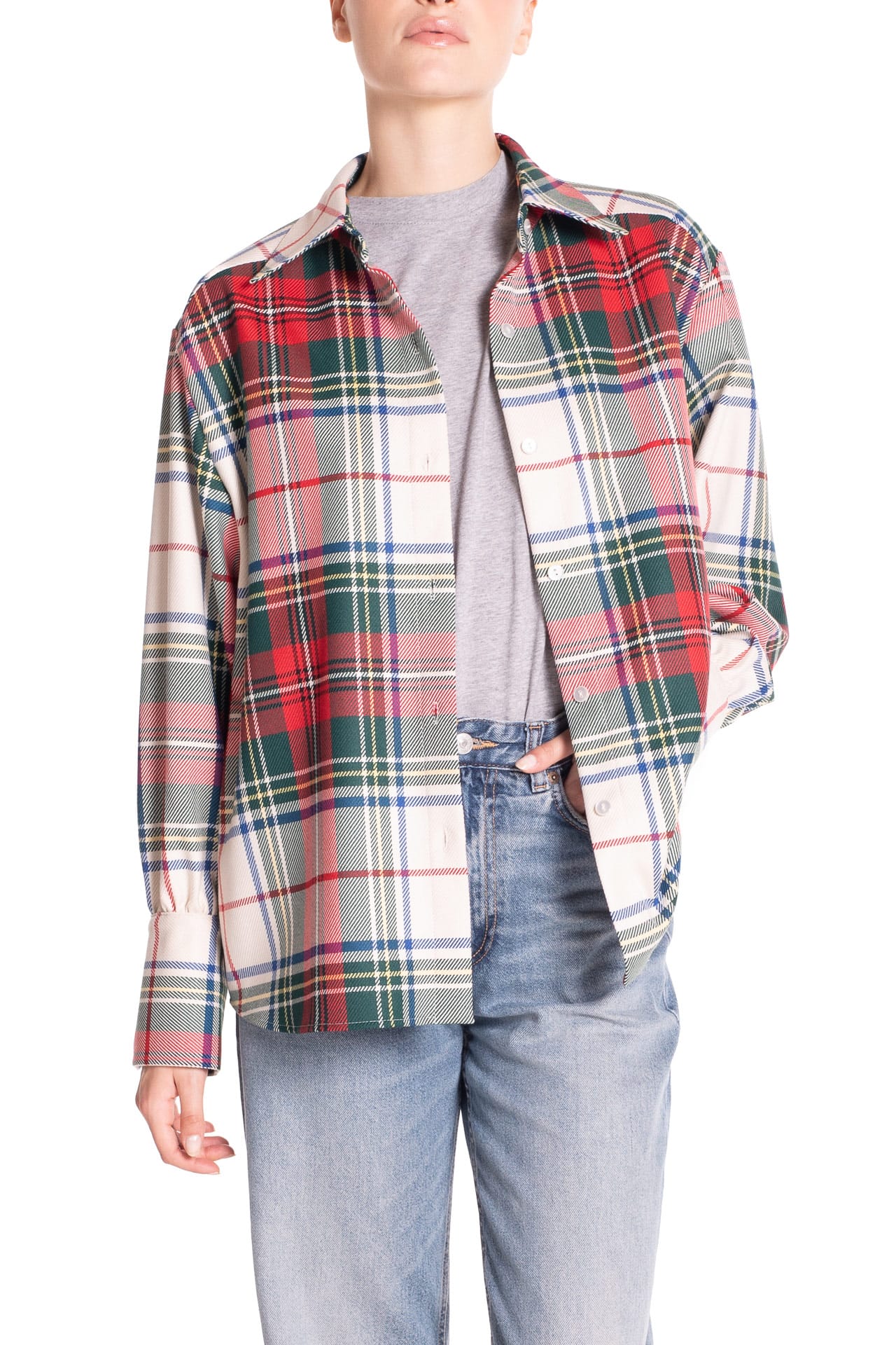 Una nuova camicia sartoriale oversize con abbottonatura frontale, realizzata in tessuto tartan di alta qualità.