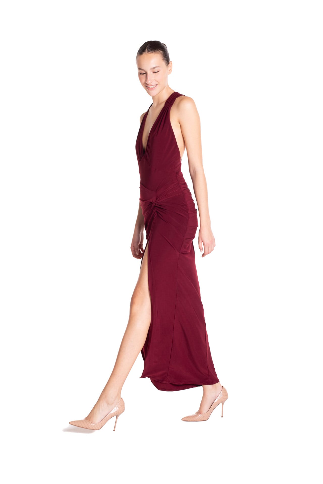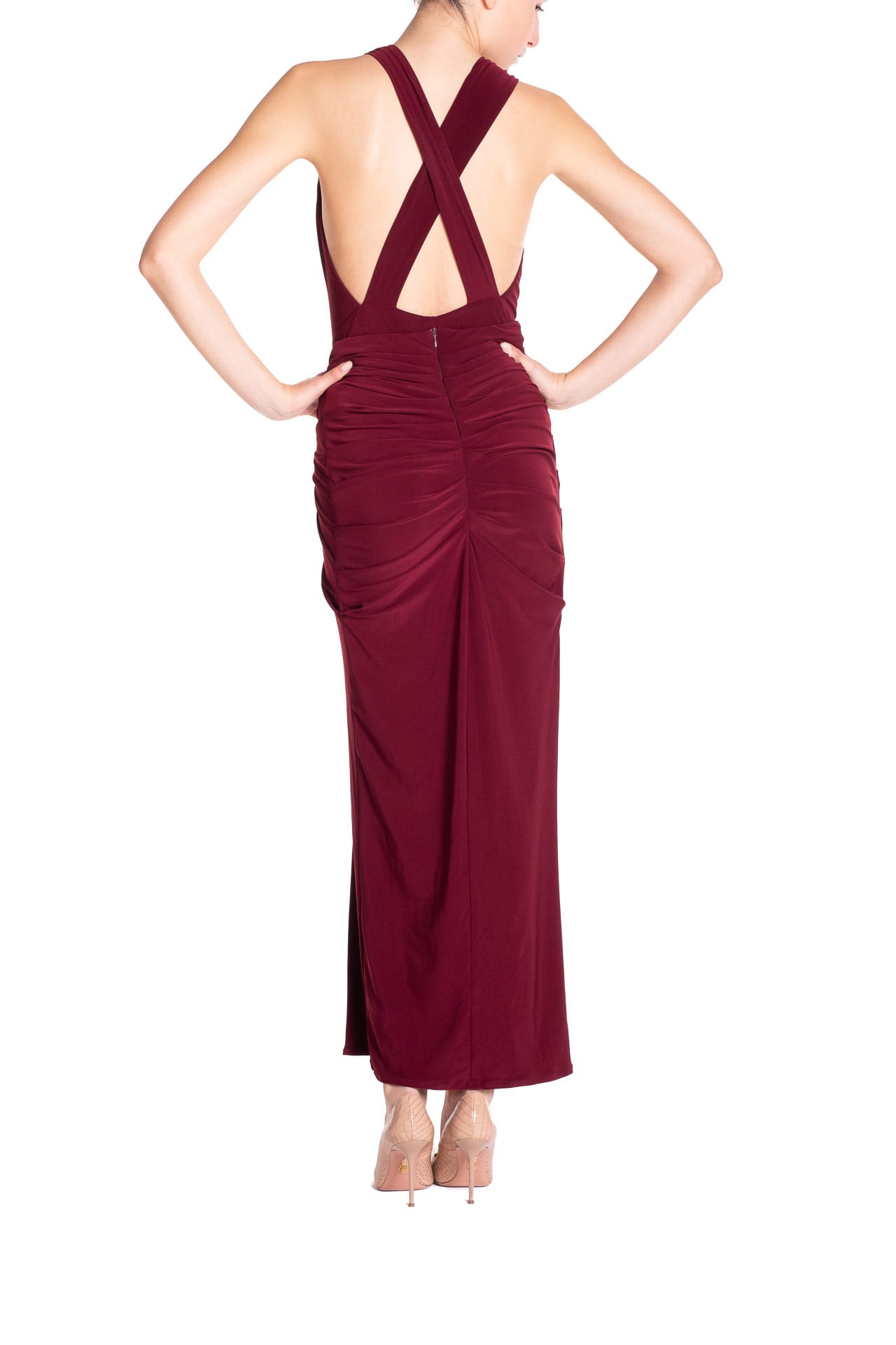 Il drappeggio in vita e sul retro crea un effetto arricciato che valorizza la silhouette, rendendola perfetta per occasioni formali, cene eleganti o eventi speciali.