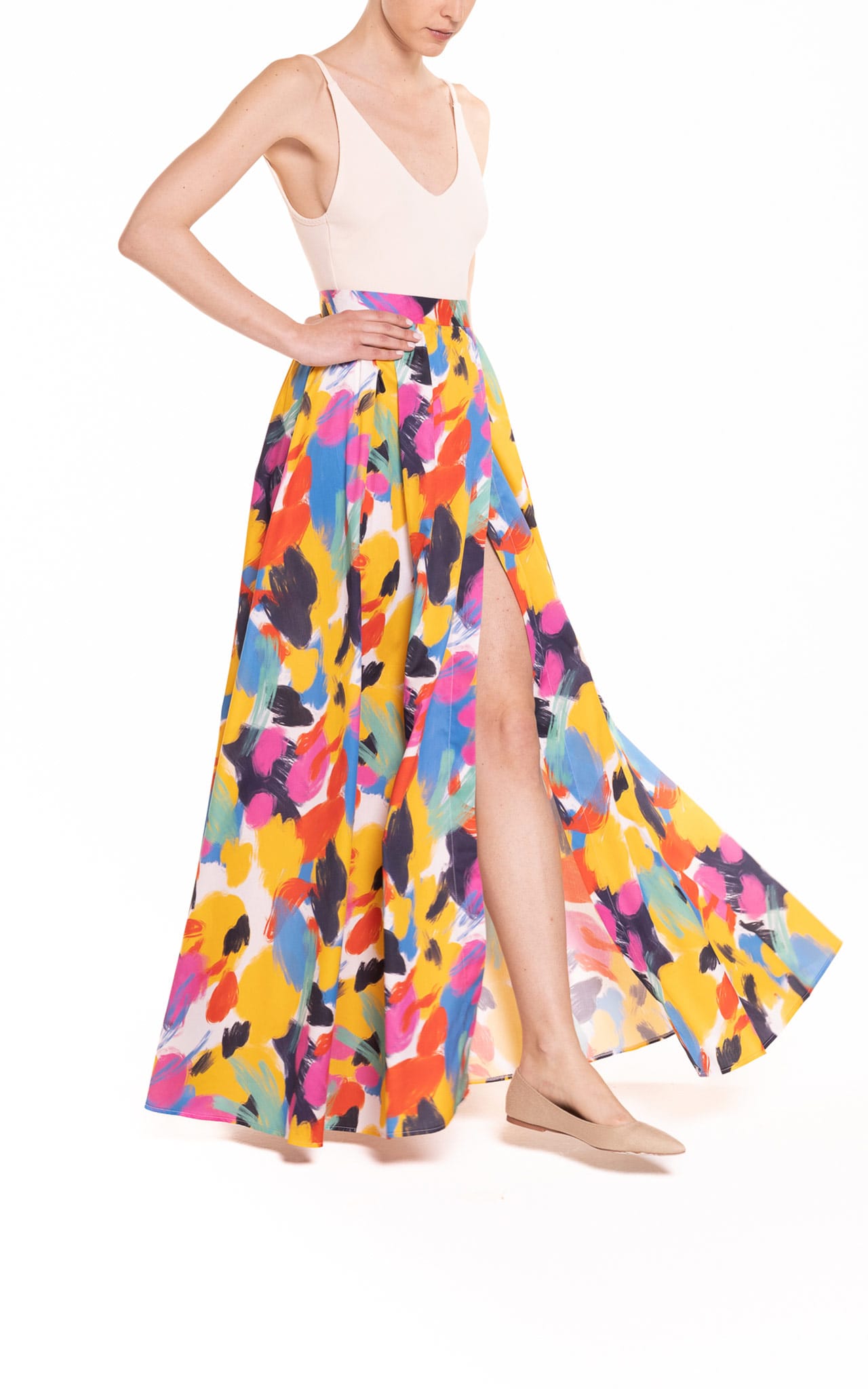 Gonna lunga a ruota ampia con spacco laterale, a vita alta, dalle linee fluide. Un modello unico, in cotone brillante, che vi farà sentire leggere, eleganti e femminili. Con un tacco o con una scarpa bassa, con una camicia o con una maglietta, sarete sempre stilose ed uniche.