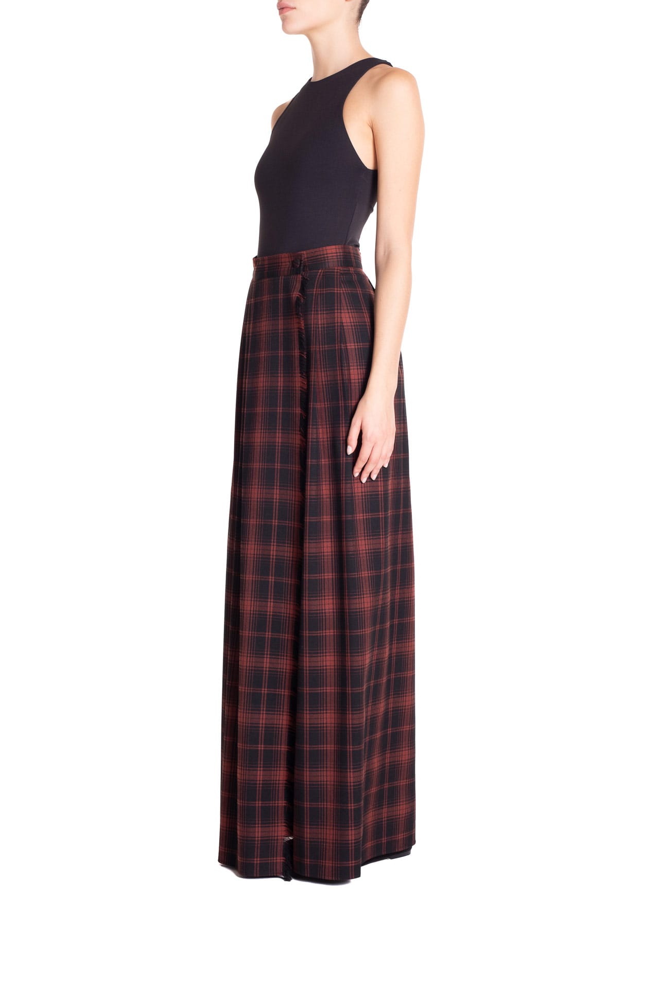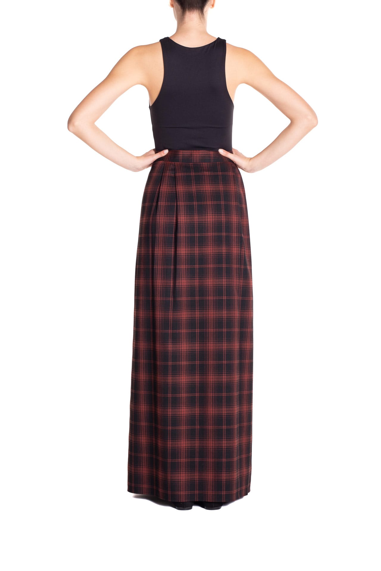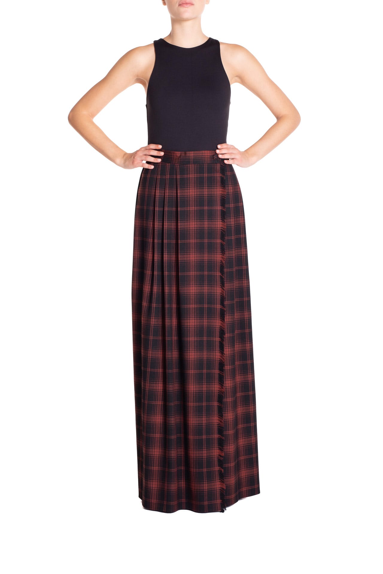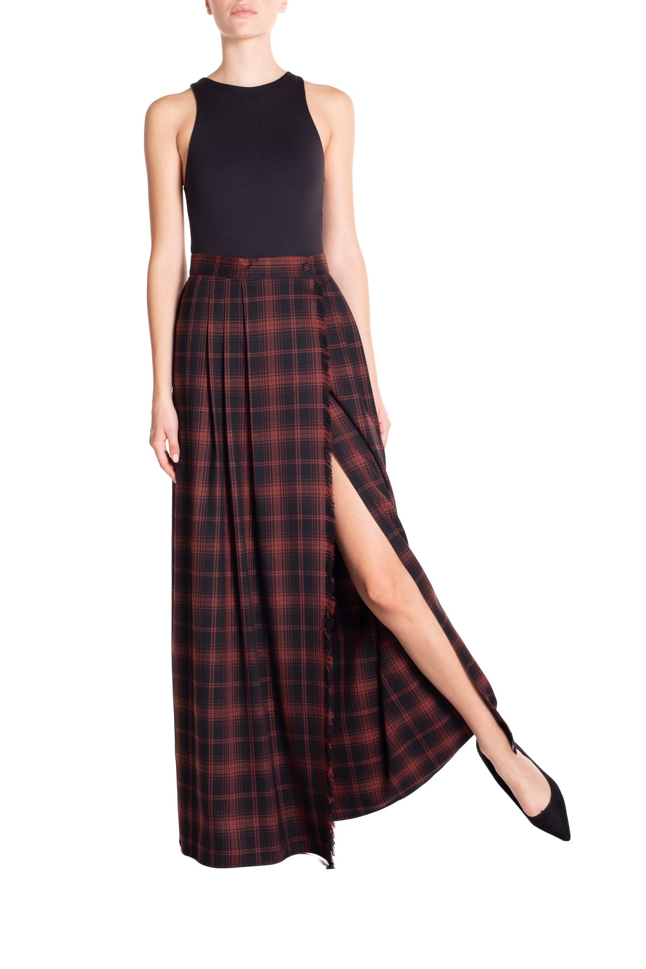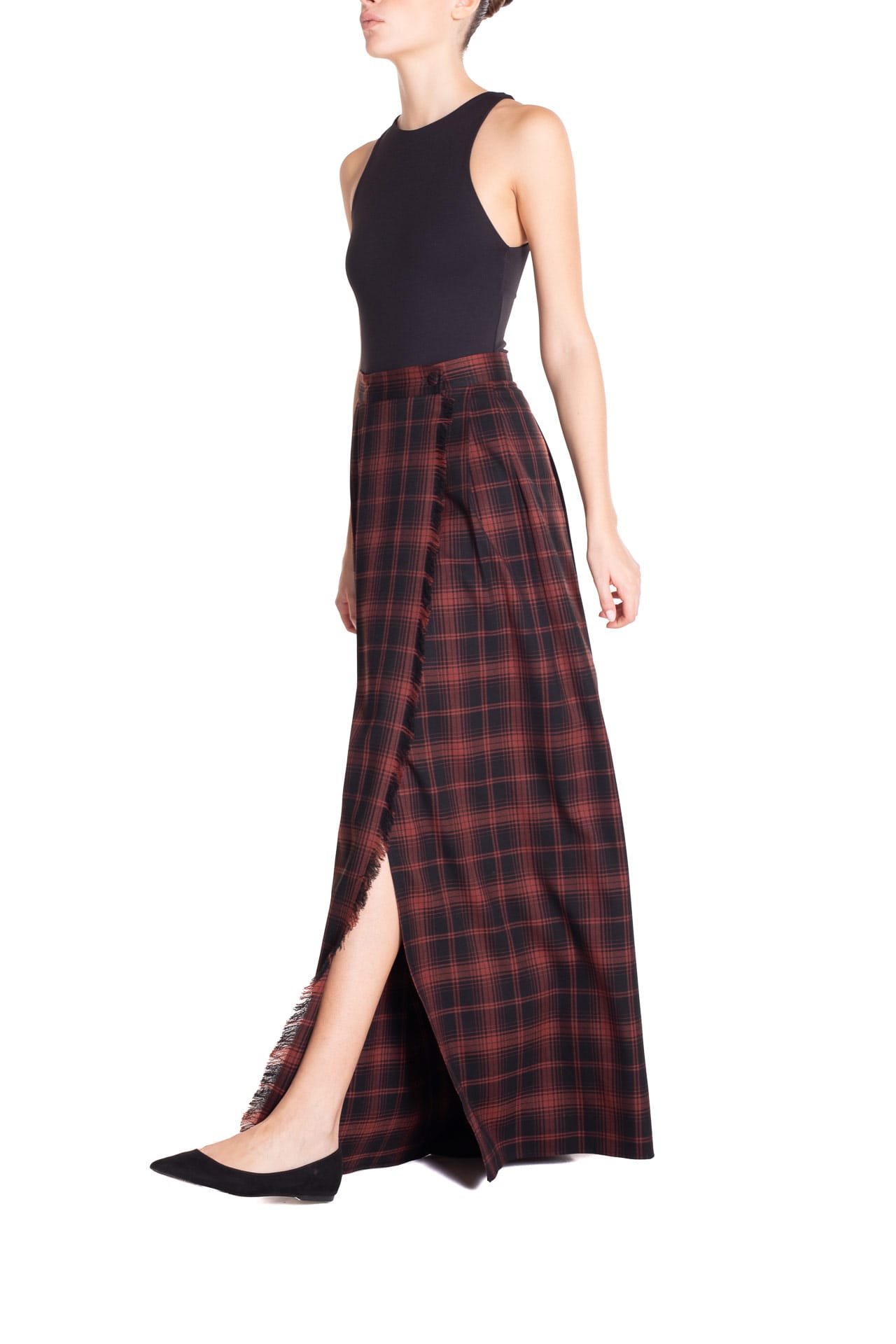 Gonna lunga a portafoglio in tartan con bordo sfilacciato, un capo dal design originale e deciso, che unisce la tradizione del tartan a dettagli contemporanei. La silhouette a portafoglio avvolge la figura con eleganza, mentre il bordo sfilacciato dona un tocco grintoso e artigianale, rendendo ogni gonna unica nel suo genere.