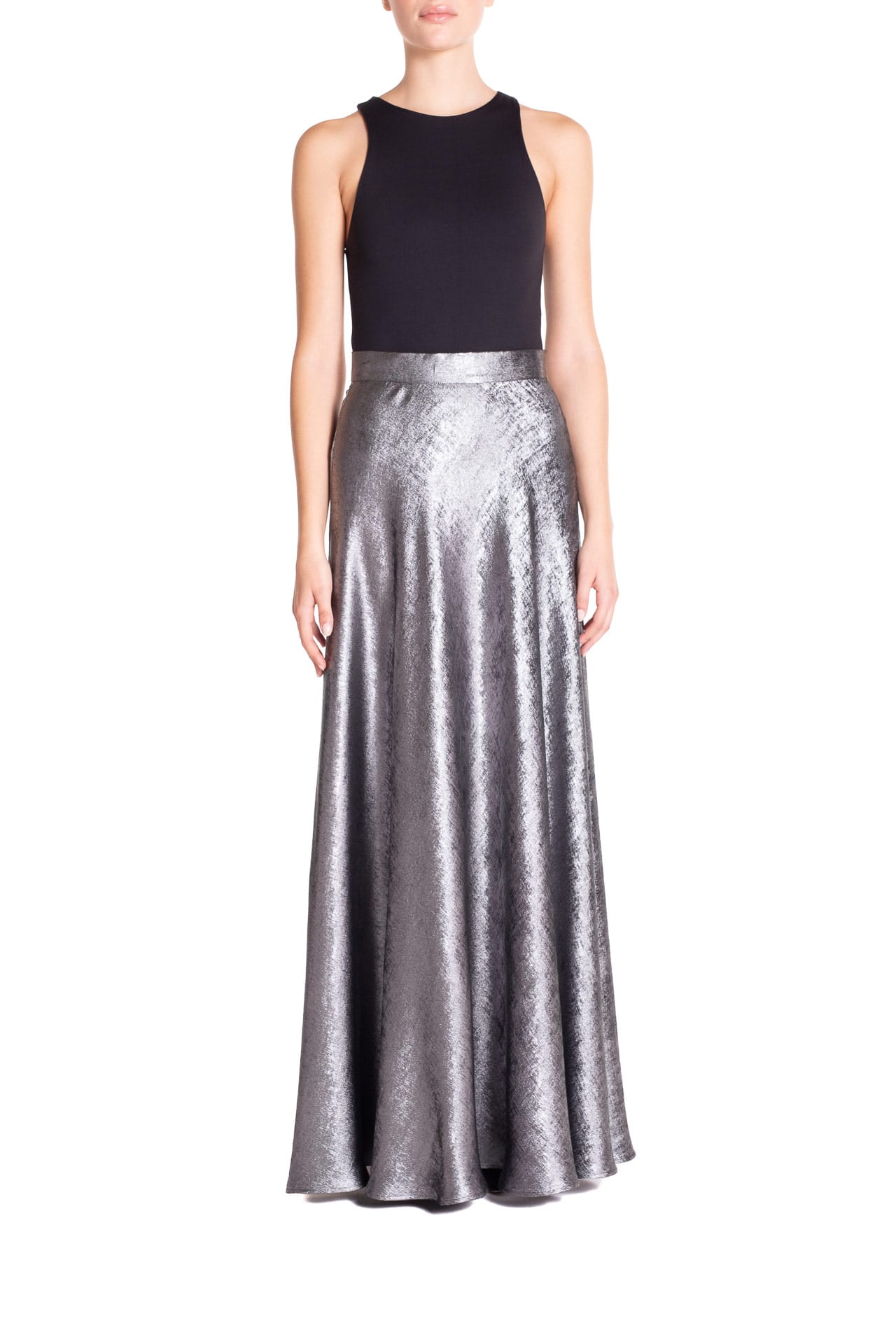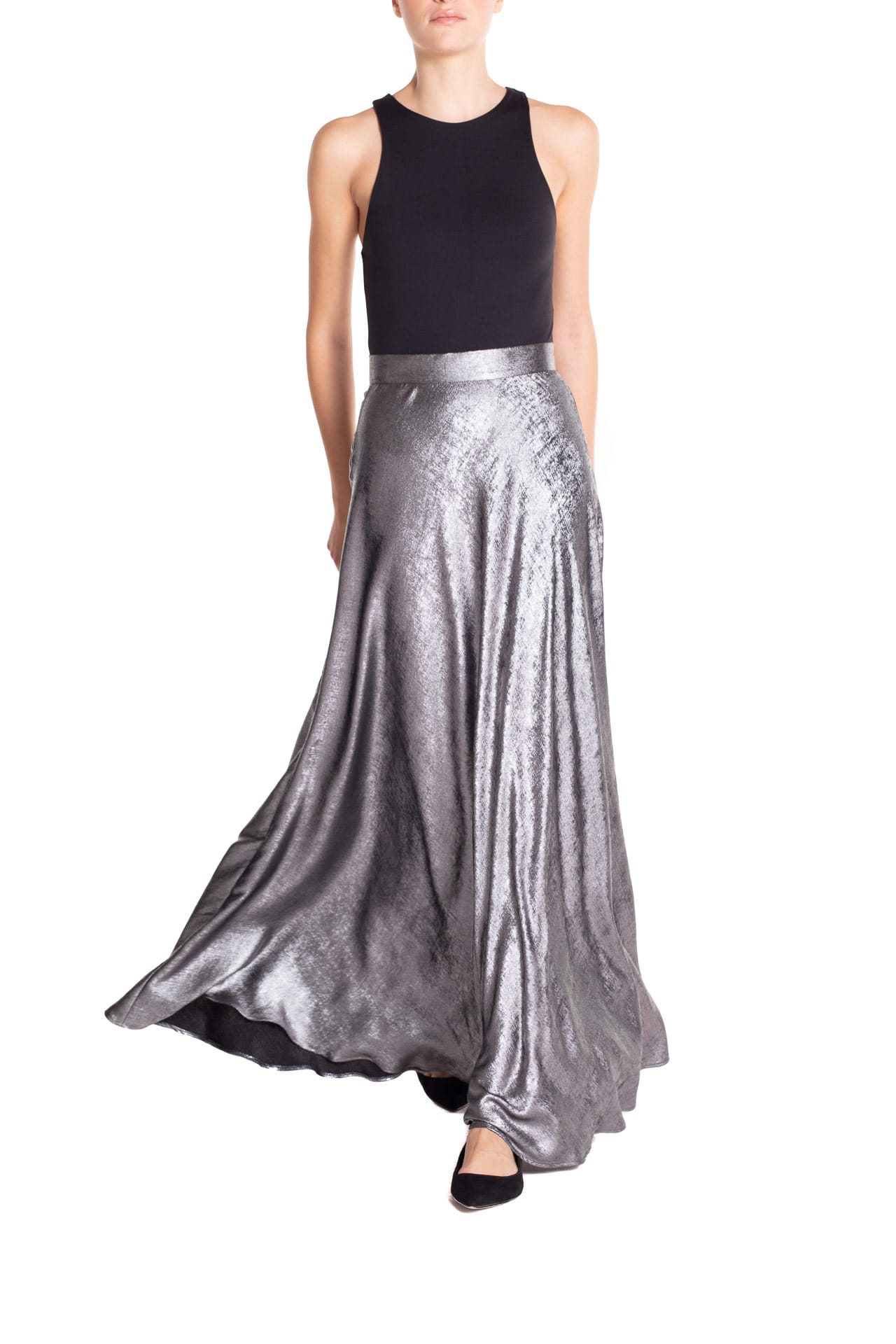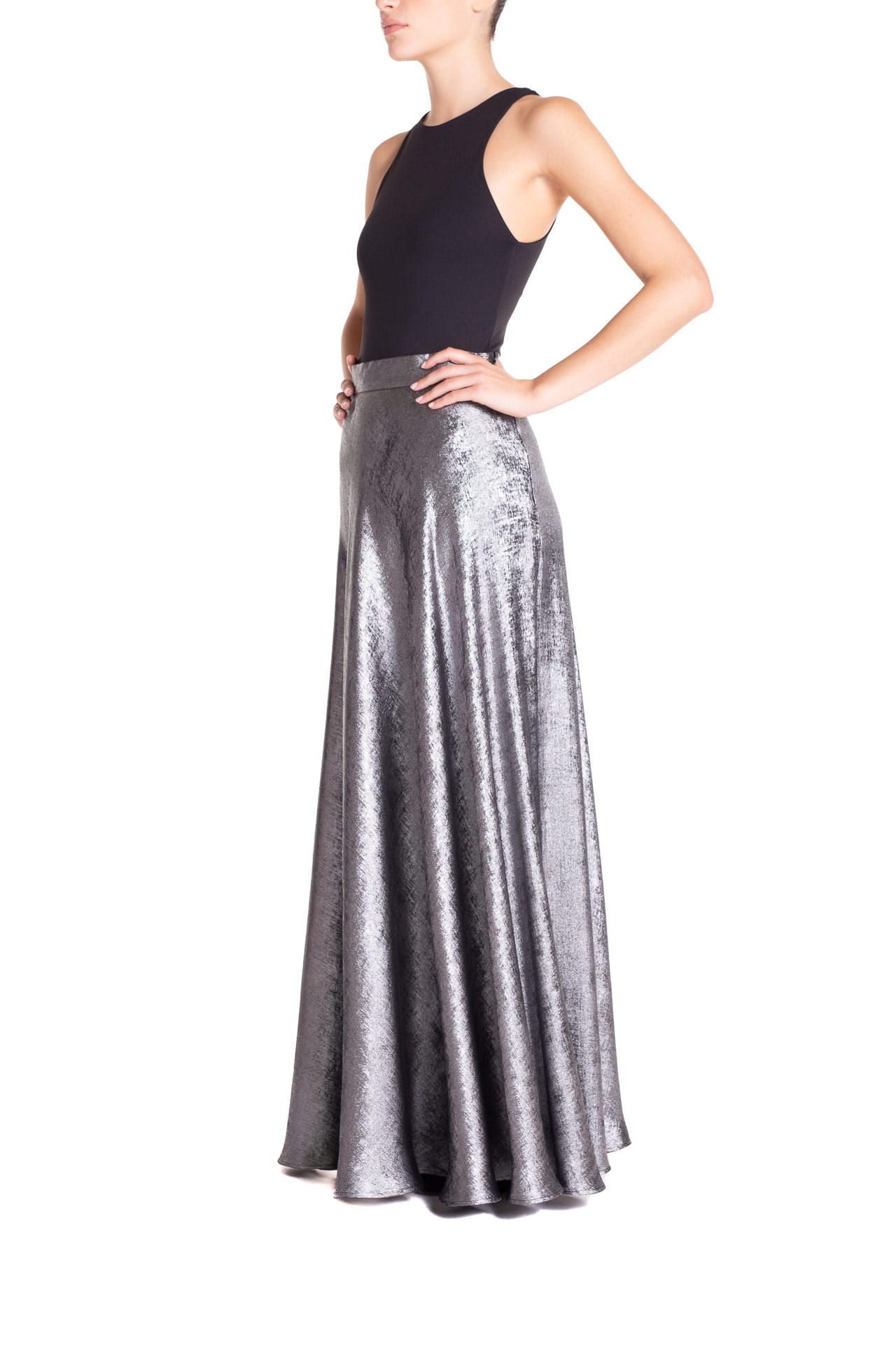 Scopri la luminosità sofisticata della gonna lunga lamé in argento o in oro, un capo scenografico e raffinato della nuova collezione Poupine.
