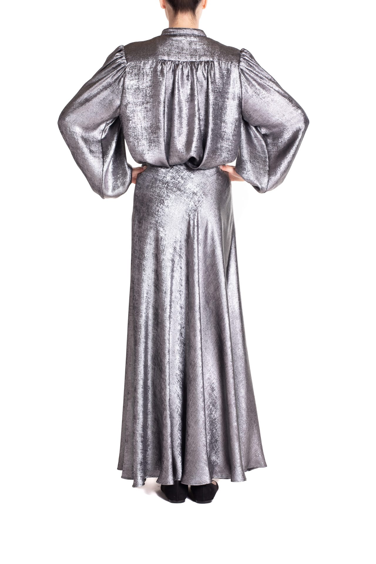 La lunghezza maxi e il taglio morbido valorizzano la silhouette con grazia, mentre il finish metallico crea un effetto glamour e contemporaneo.