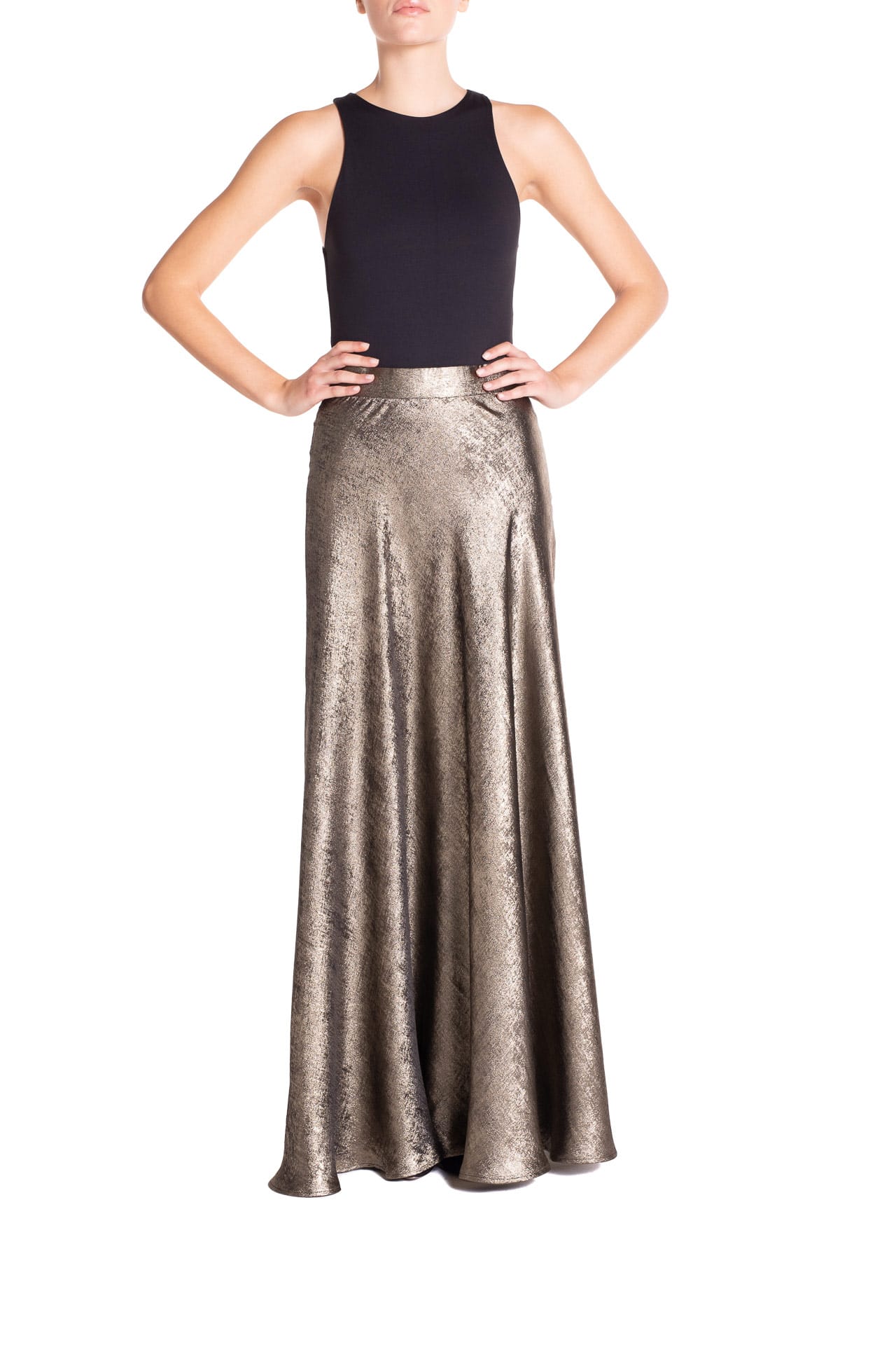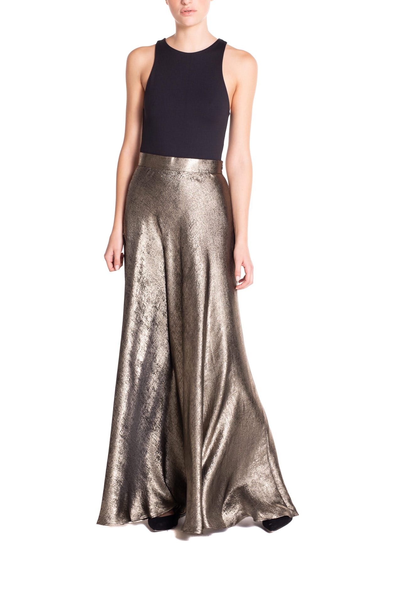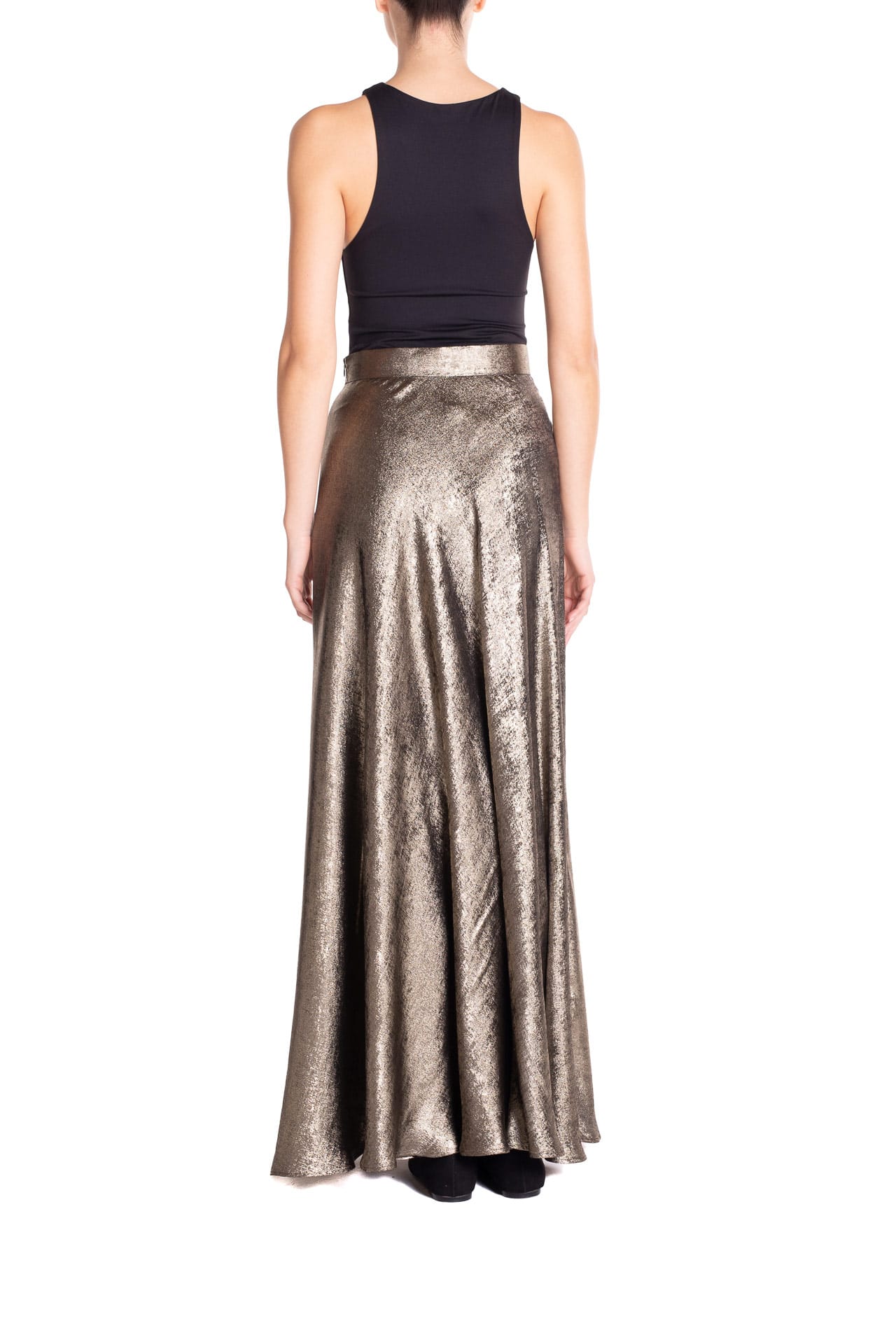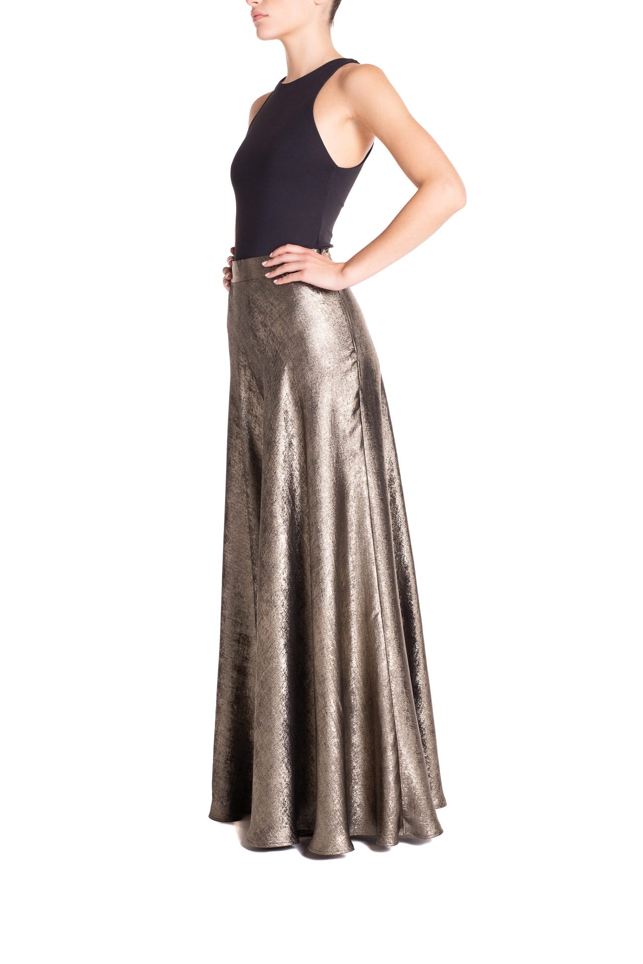 Scopri la luminosità sofisticata della gonna lunga lamé in argento o in oro, un capo scenografico e raffinato della nuova collezione Poupine.