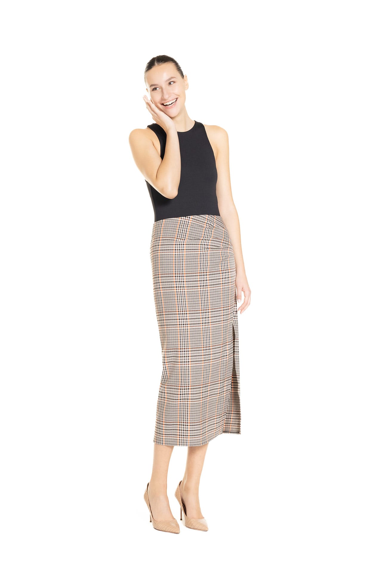 Longuette spacco laterale Tartan Pied de Poule Marrone e Arancio