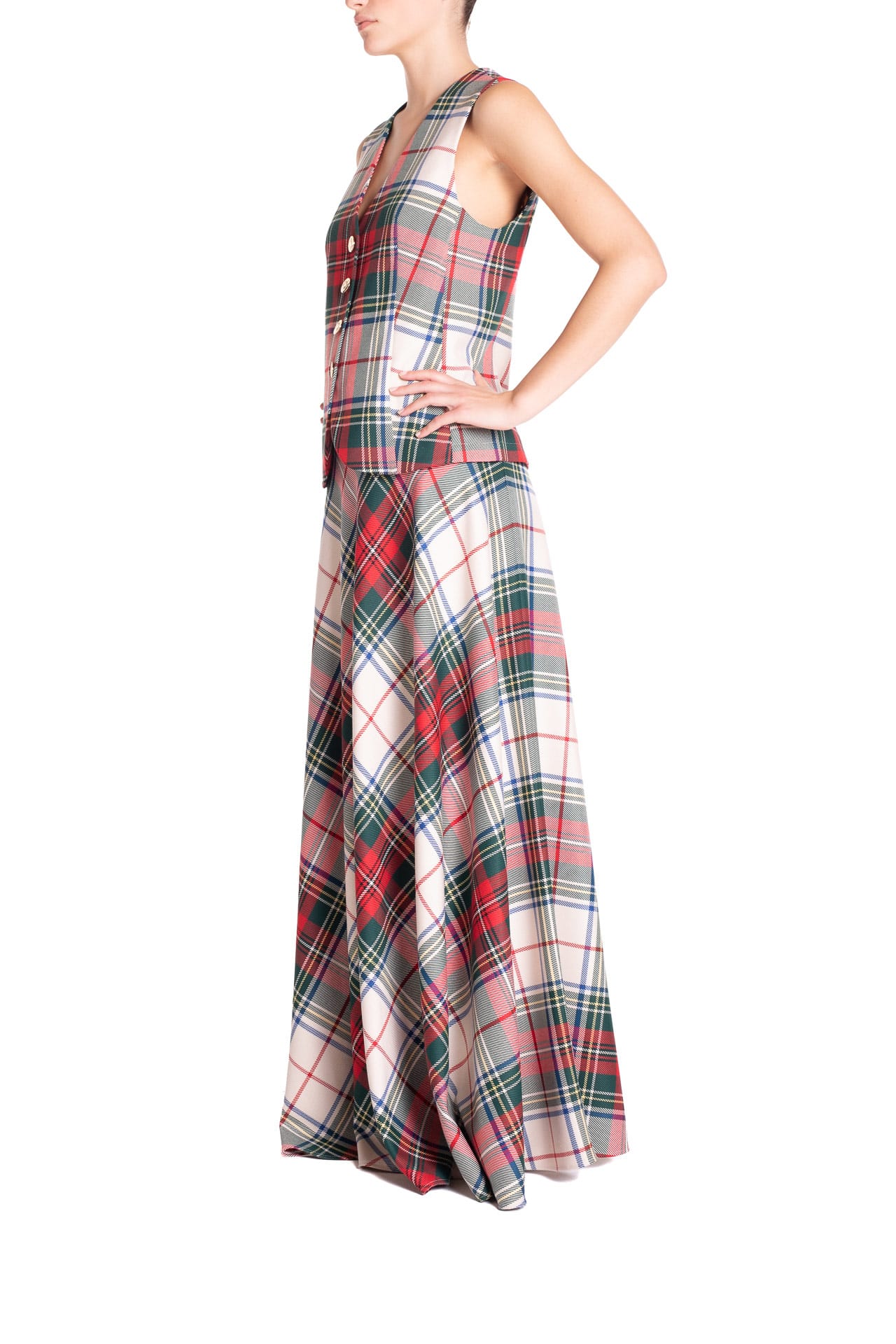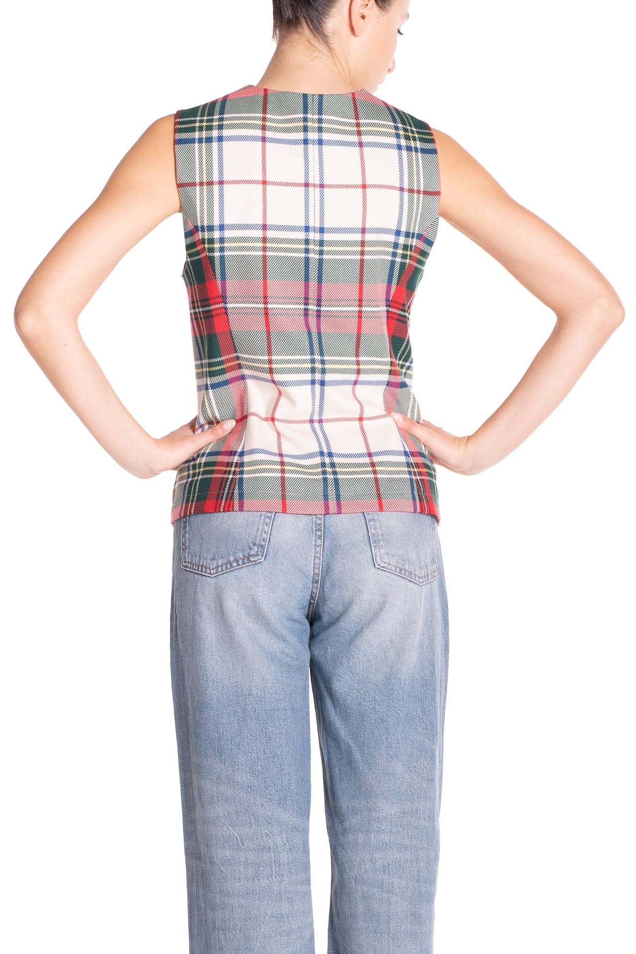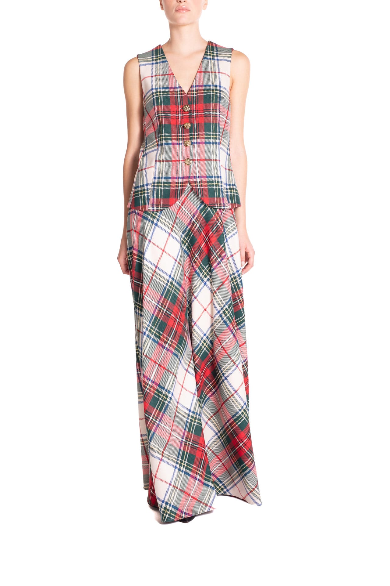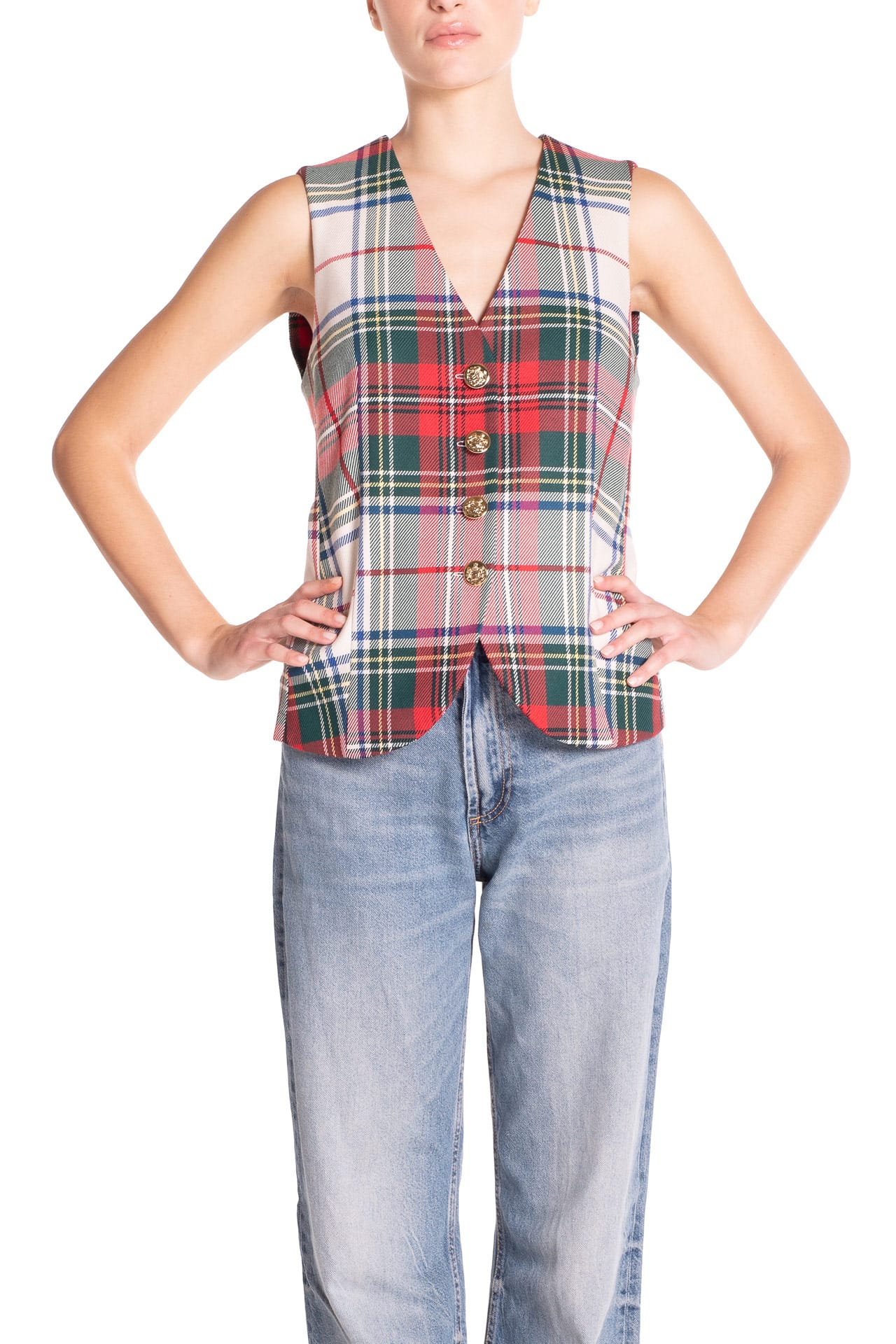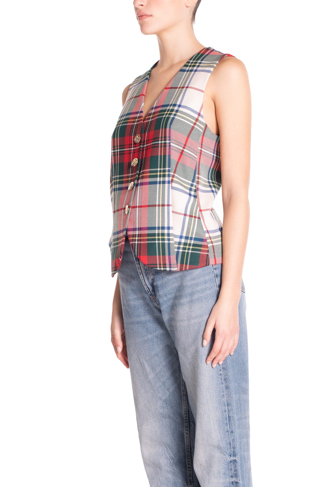 Aggiungi un tocco di raffinatezza al tuo guardaroba con il gilet sartoriale da donna in tartan, impreziosito da bottoni dorati.