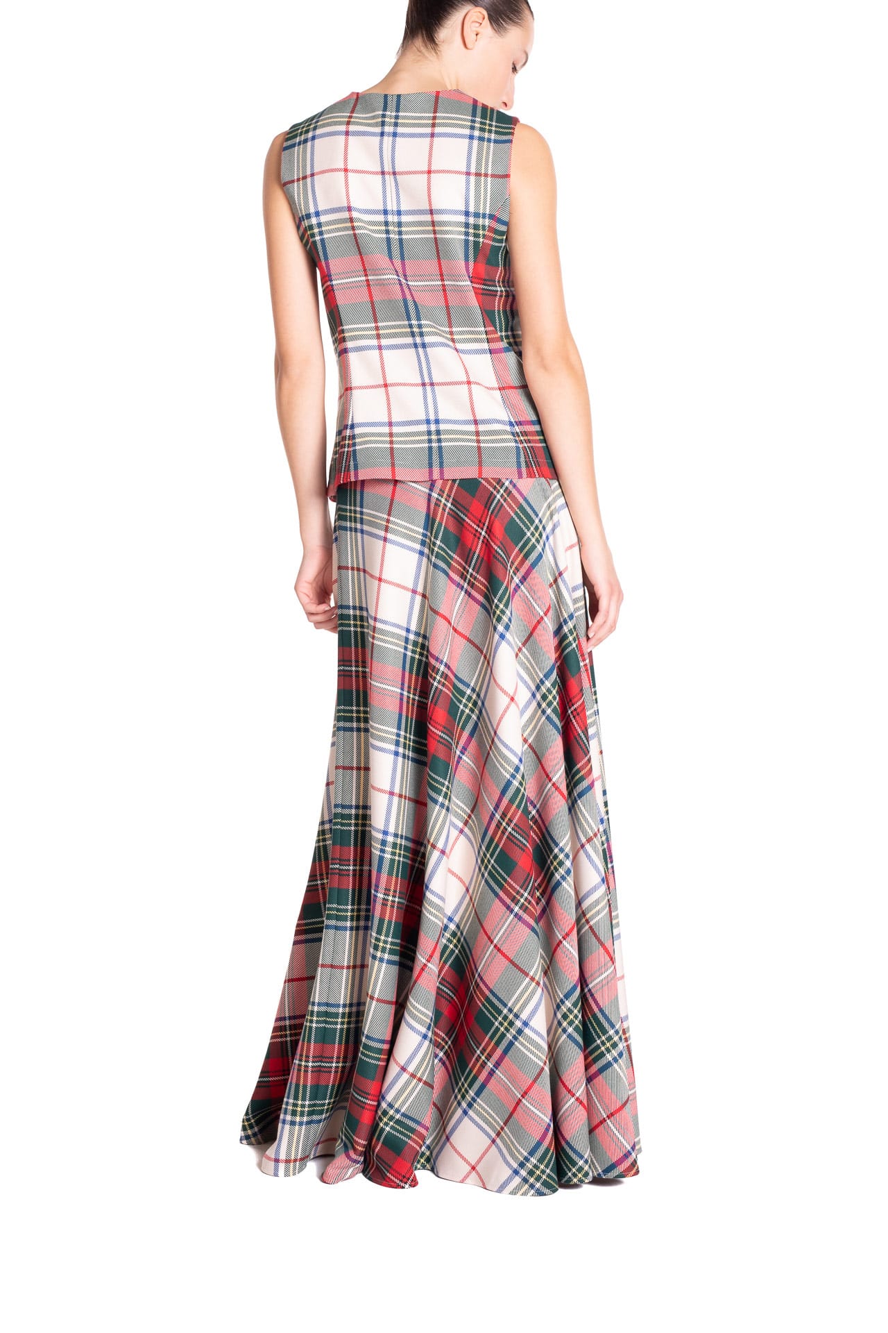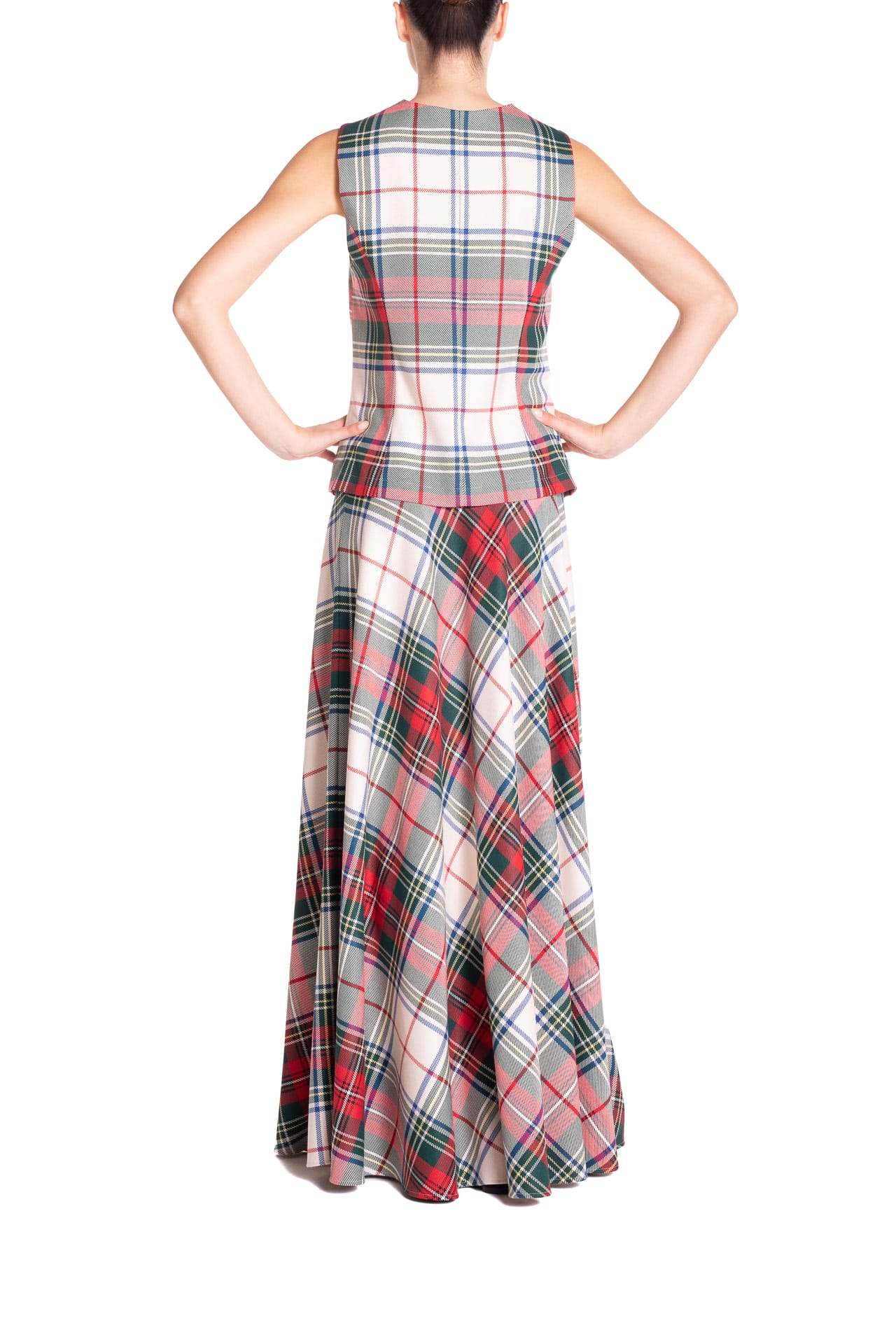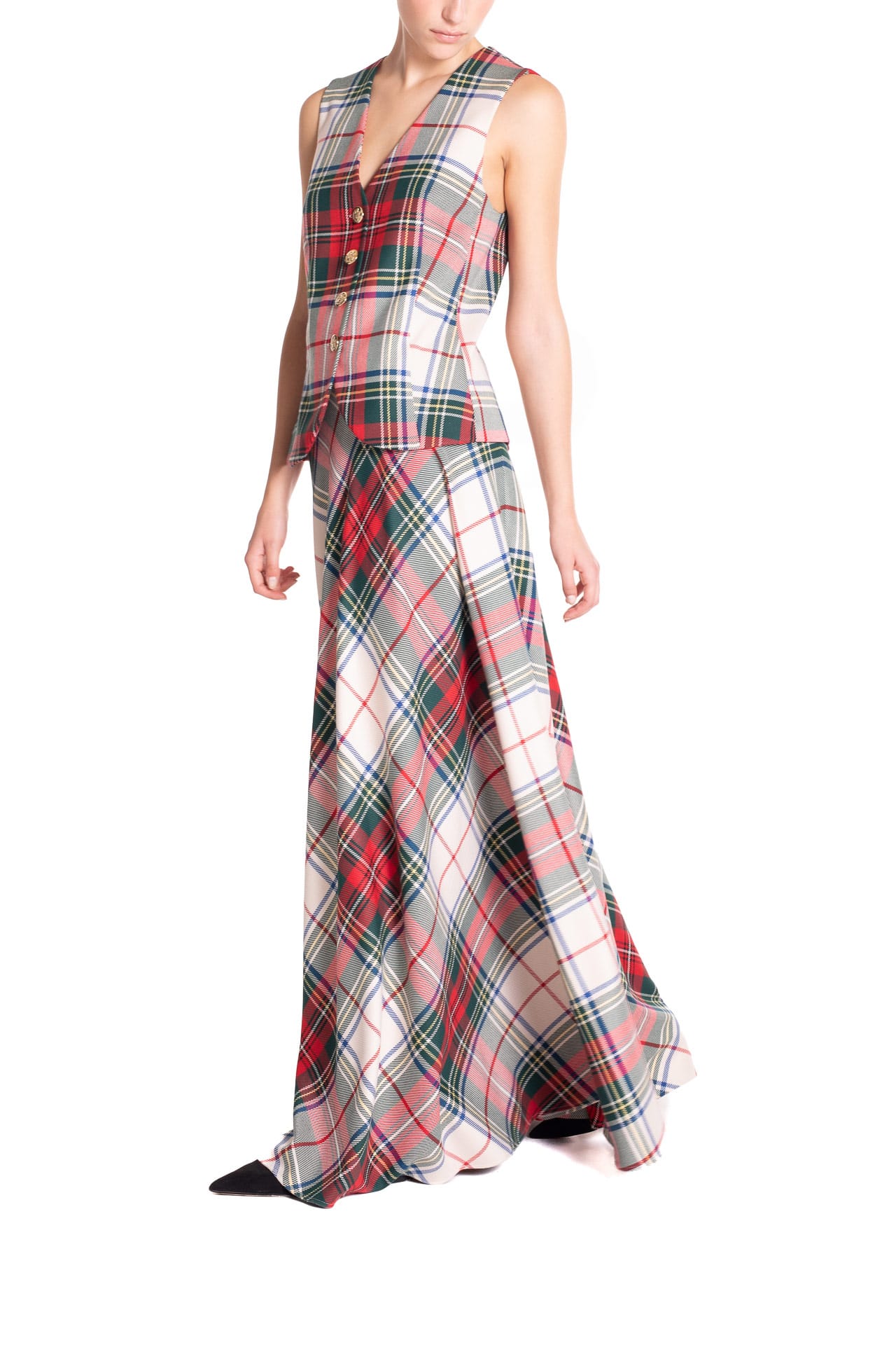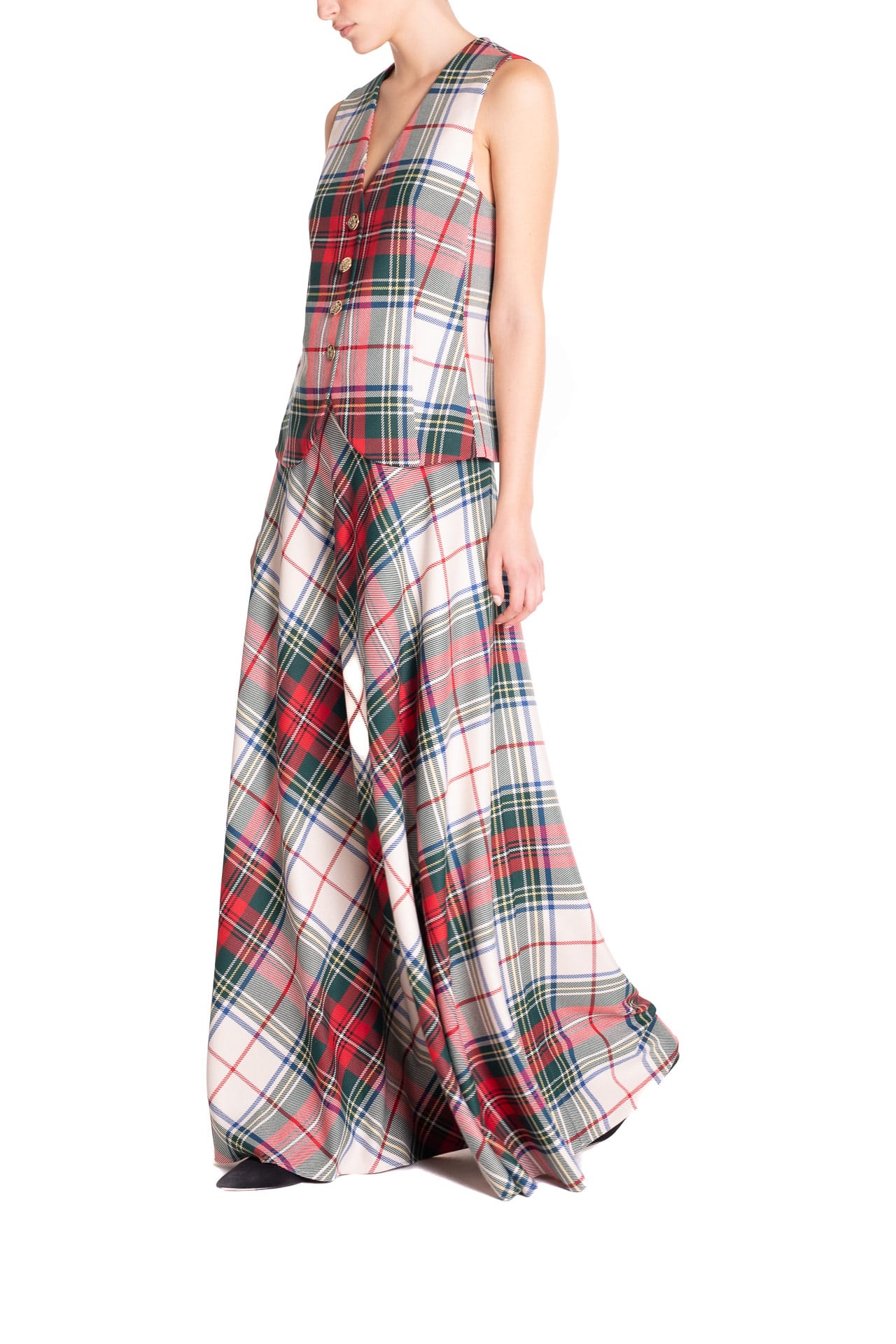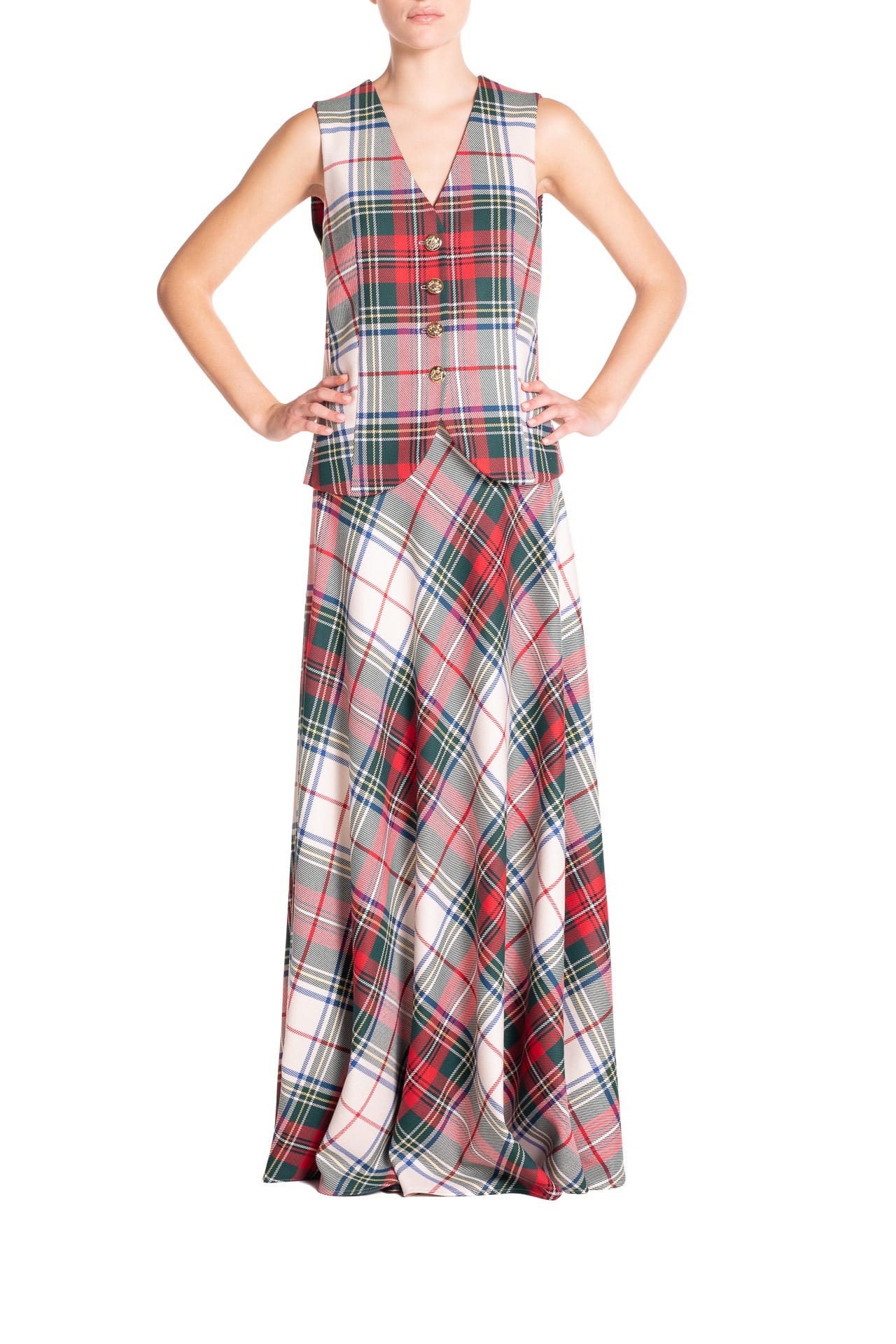 Aggiungi un tocco di raffinatezza al tuo guardaroba con il gilet sartoriale da donna in tartan, impreziosito da bottoni dorati.