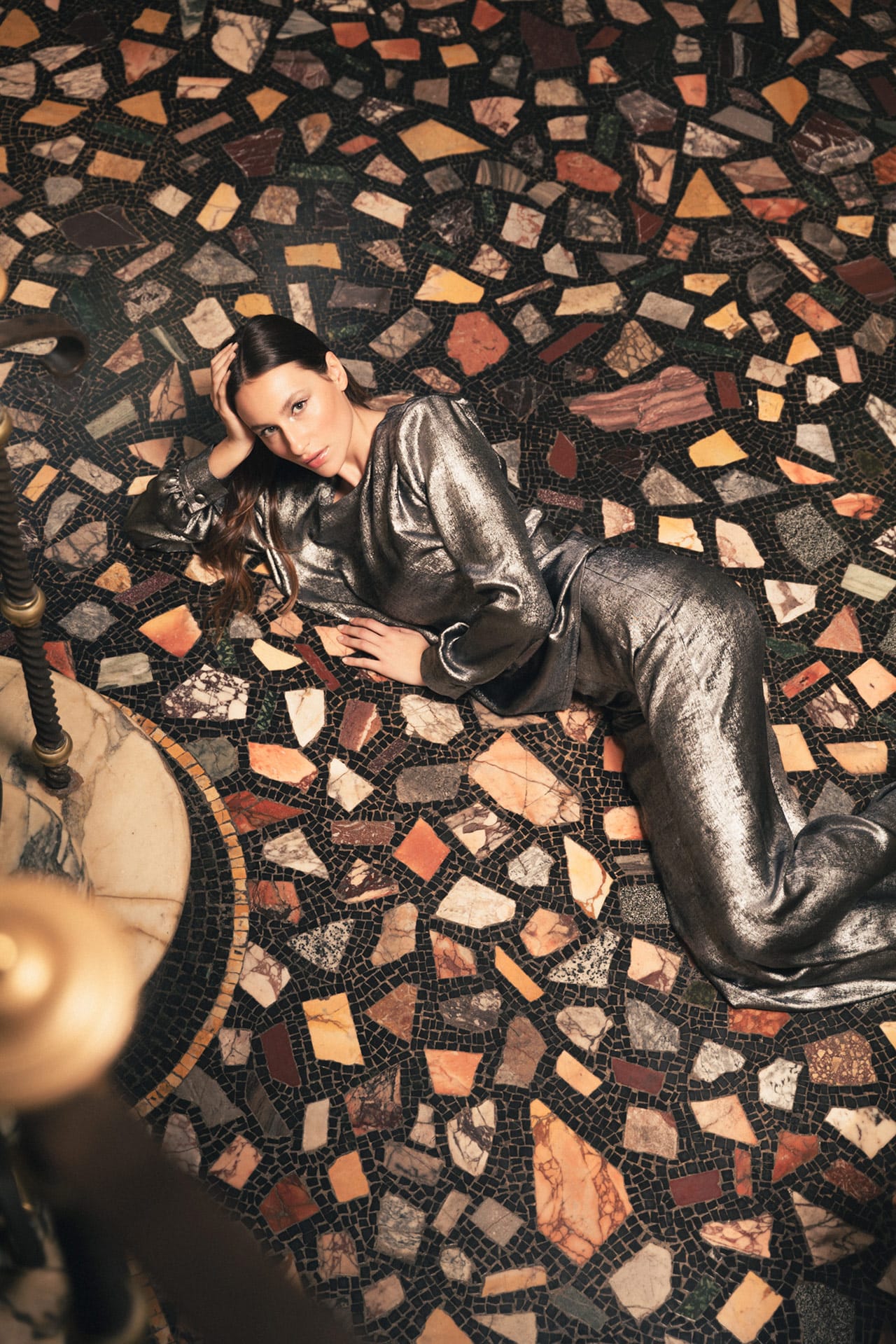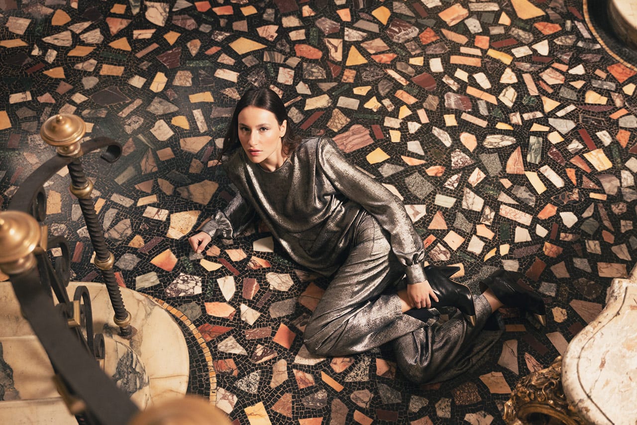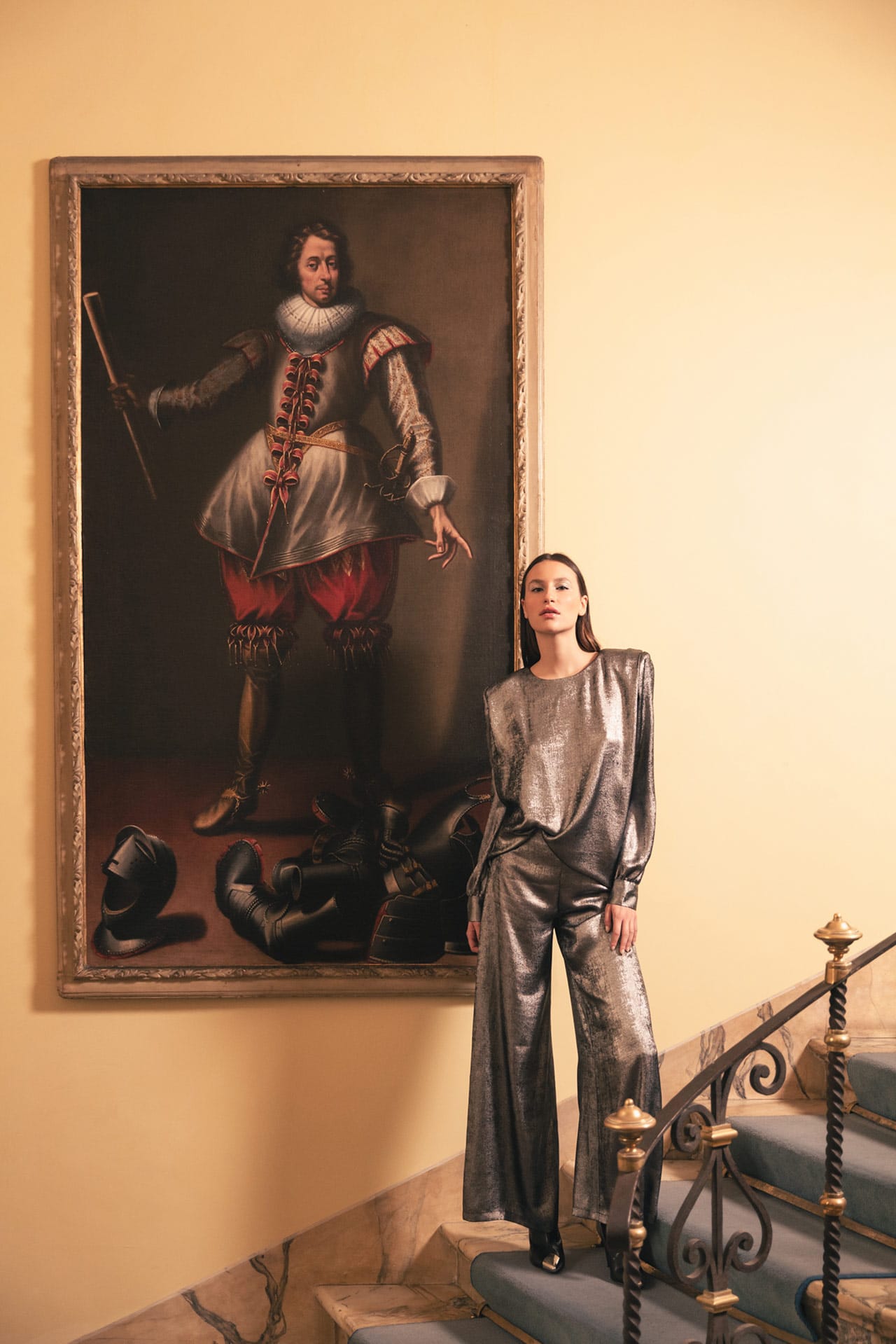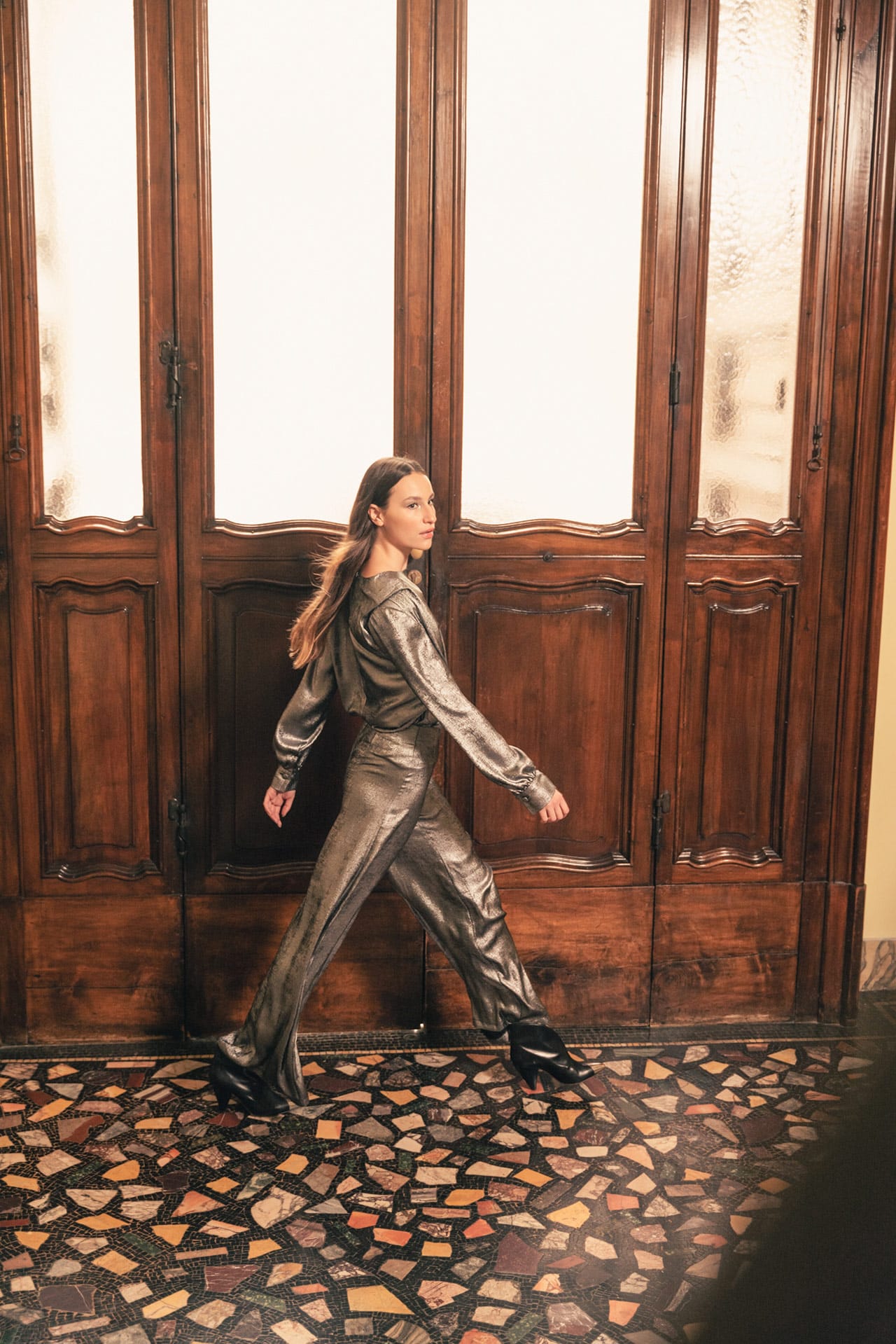 Add a touch of glamour to your look with the silver and gold lamé top by Poupine, an elegant and sophisticated piece perfect for special evenings and chic events. Made from metallic fabric with a shimmering finish, it catches the light with every move, creating a luminous and modern effect. The design features structured shoulders and long sleeves with buttoned cuffs, while the deep open back adds sensuality and character. Ideal to pair with palazzo pants, elegant skirts, or premium jeans for a versatile and refined outfit.