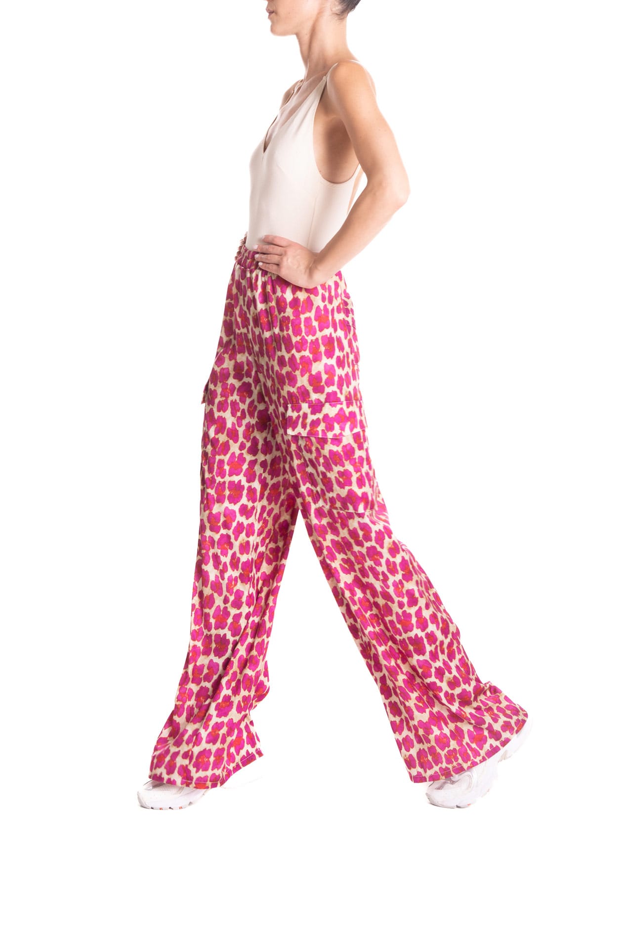 Easy-to-wear animalier cargo pants, with a loose fit on the legs, like a skirt, but with the comfort of pants; Suitable with both sneakers and high-heeled shoes. Oversized flap pockets on each leg and elastic waistband. A must-have of the season, so versatile that it is a trendy garment to keep in your wardrobe. Make it bold and unexpected wearing it with a high-cut bodysuit or a comfortable sweater, with a classic shirt or t-shirt, a blazer and maxi bag.